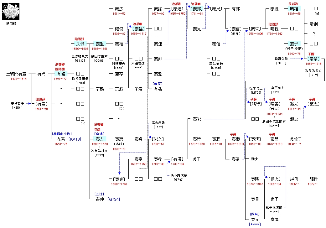 | AB04:安倍泰茂 | 阿倍阿加古 ― 安倍兄雄 ― 安倍泰親 ― 安倍泰茂 ― 土御門有宣 | AB05:土御門有宣 | ● |