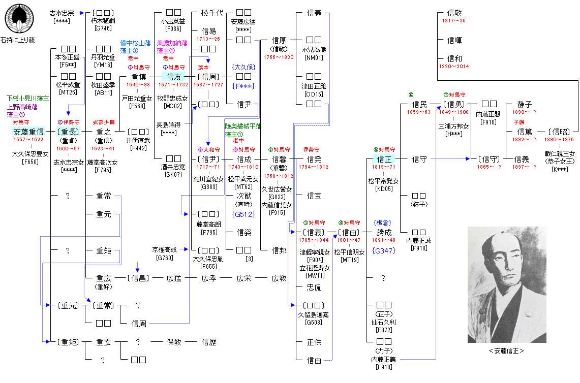 | AB15:安藤家重 | 阿倍阿加古 ― 阿倍比羅夫 ― 安倍頼時 ― 安藤家重 ― 安藤重信 | AB16:安藤重信 | ● |