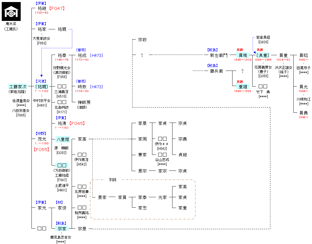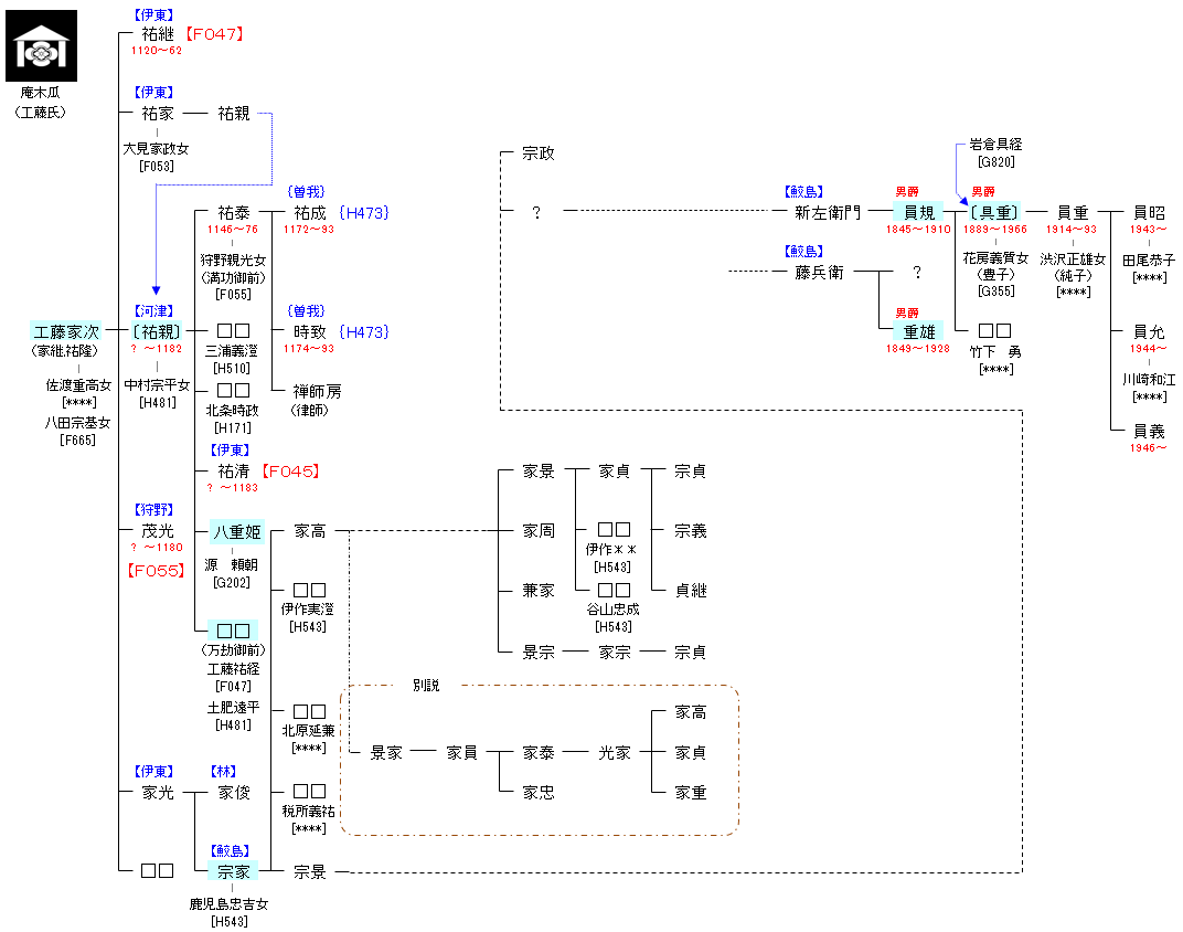 伊豆国久須美荘(久須見荘,葛見荘:伊東荘,宇佐美荘,大見荘,河津荘などから成る)の開発領主。伊東氏の祖であり、狩野氏,河津氏などを派生した。工藤祐隆,伊東家次とも。 |