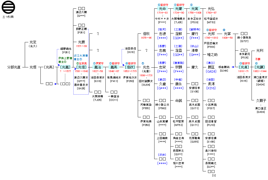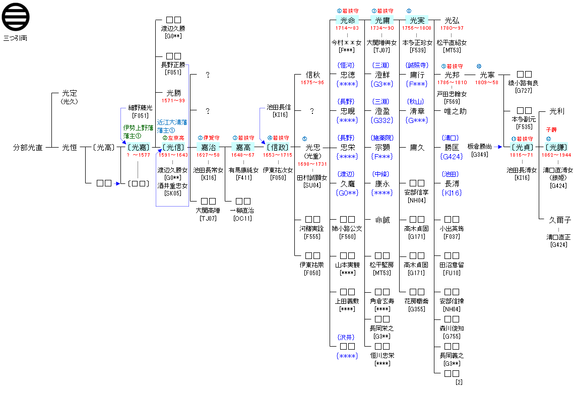 | F051:工藤祐長 | 藤原武智麻呂 ― 藤原乙麻呂 ― 藤原為憲 ― 工藤家次 ― 伊東祐継 ― 工藤祐長 ― 分部光直 | F052:分部光直 | ● |