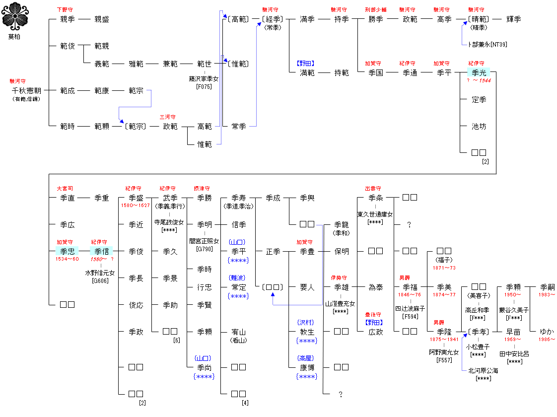 | F074:藤原季兼 | 藤原武智麻呂 ― 藤原巨勢麻呂 ― 藤原貞嗣 ― 藤原永頼 ― 藤原季兼 ― 千秋憲朝 | F076:千秋憲朝 | ● |