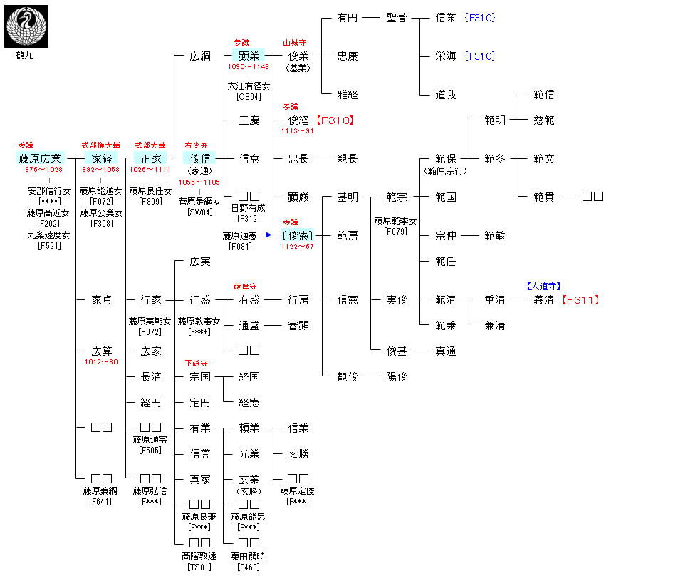 | F308:藤原濱雄 | 藤原鎌足 ― 藤原房前 ― 藤原真楯 ― 藤原真夏 ― 藤原濱雄 ― 藤原広業 | F309:藤原広業 |