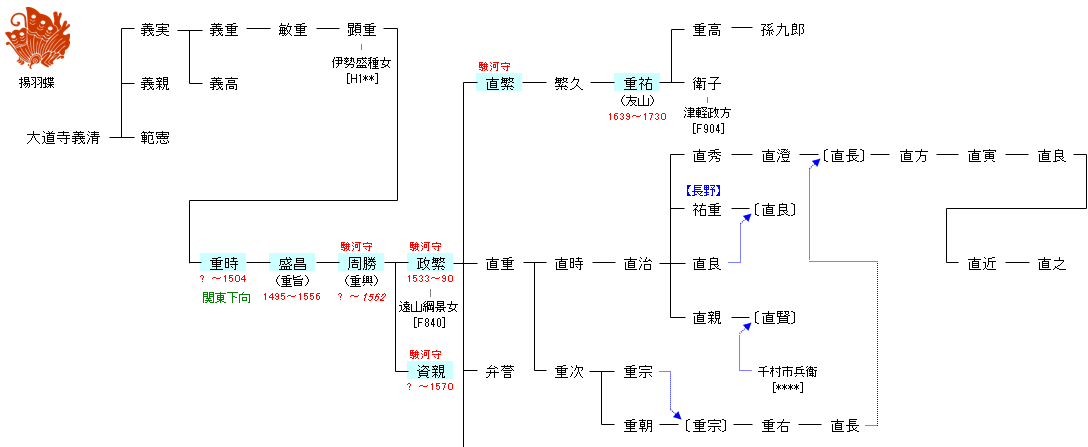 重時から政繁までは諸説あり定かではない。そもそも早雲と一緒に駿河へ下向したのがこの盛昌である、とする異説もある。 |