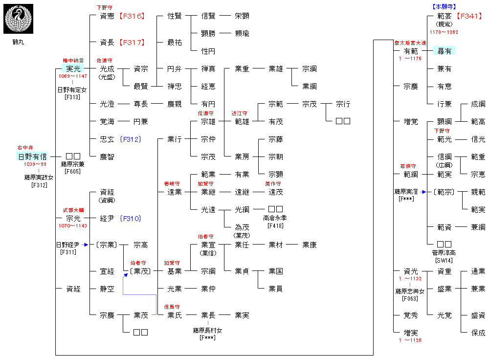 | F313:日野実綱 | 藤原鎌足 ― 藤原房前 ― 藤原内麻呂 ― 藤原真夏 ― 日野資業 ― 日野実綱 ― 日野有信 | F315:日野有信 |