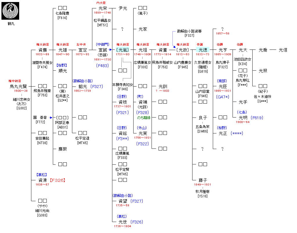 | F324:烏丸豊光 | 藤原真夏 ― 日野資業 ― 日野実綱 ― 日野有信 ― 日野資長 ― 日野資宣 ― 日野資名 ― 烏丸豊光 ― 烏丸光賢 | F325:烏丸光賢 |