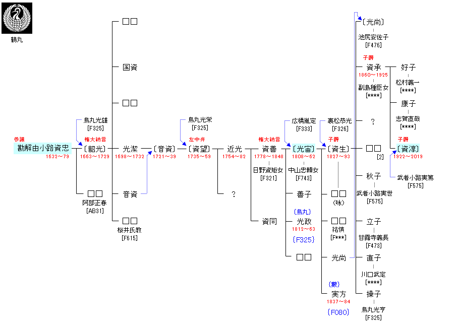 | F327:烏丸豊光 | 日野資業 ― 日野実綱 ― 日野有信 ― 日野資長 ― 日野資宣 ― 日野資名 ― 烏丸豊光 ― 勘解由小路資忠 | F324:勘解由小路資忠 | ● |