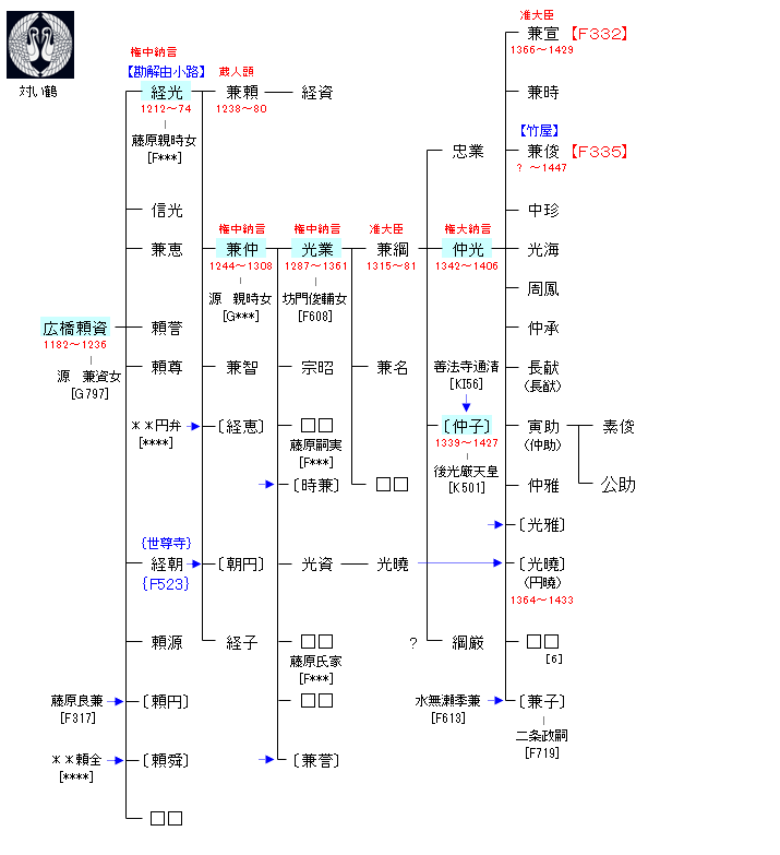 | F317:日野資長 | 藤原真夏 ― 日野資業 ― 日野実綱 ― 日野有信 ― 日野資長 ― 広橋頼資 | F331:広橋頼資 |