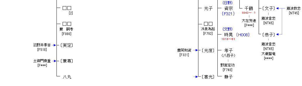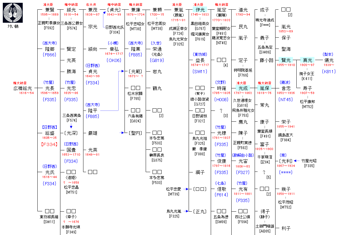 | F332:広橋兼宣 | 藤原真夏 ― 日野資業 ― 日野実綱 ― 日野有信 ― 日野資長 ― 広橋頼資 ― 広橋兼宣 ― 広橋総光 | F333:広橋総光 |