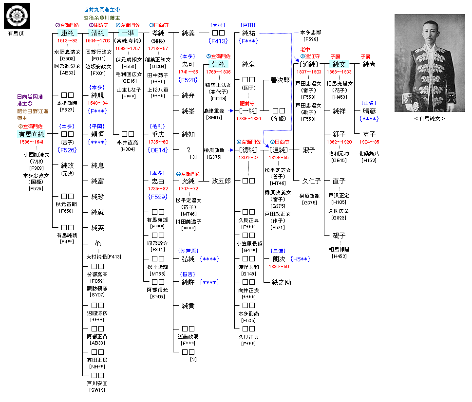 | F410:有馬経澄 | 藤原鎌足 ― 藤原房前 ― 藤原真楯 ― 藤原冬嗣 ― 藤原長良 ― 藤原遠経 ― 有馬経澄 ― 有馬直純 | F411:有馬直純 | ● |