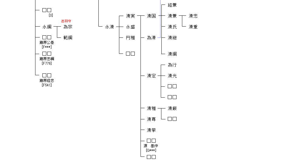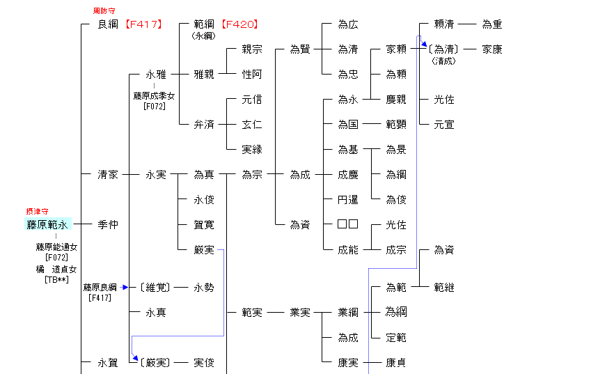 | F415:藤原清経 | 藤原鎌足 ― 藤原房前 ― 藤原真楯 ― 藤原冬嗣 ― 藤原長良 ― 藤原清経 ― 藤原範永 | F416:藤原範永 |