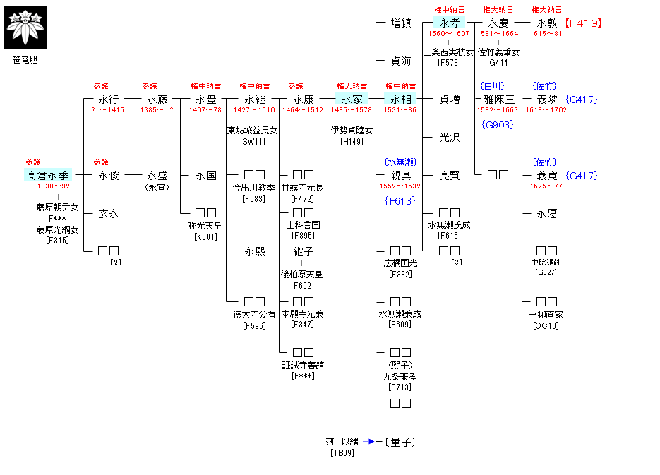 | F417:藤原良綱 | 藤原冬嗣 ― 藤原長良 ― 藤原清経 ― 藤原範永 ― 藤原良綱 ― 高倉永季 | F418:高倉永季 |