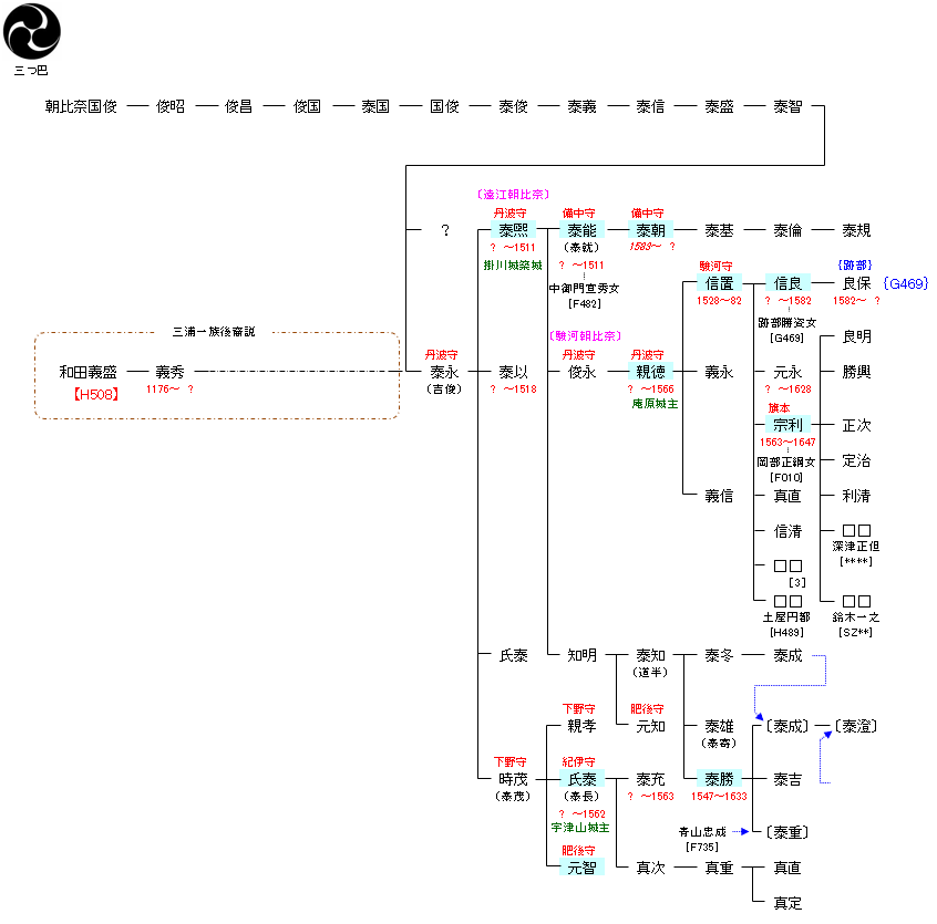 | F433:藤原頼祐 | 藤原鎌足 ― 藤原房前 ― 藤原内麻呂 ― 藤原冬嗣 ― 藤原良門 ― 藤原雅正 ― 藤原頼祐 ― 朝比奈国俊 | F434:朝比奈国俊 | ● |