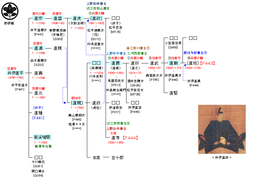 | F441:井伊共保 | 藤原鎌足 ― 藤原房前 ― 藤原内麻呂 ― 藤原冬嗣 ― 藤原良門 ― 井伊共保 ― 井伊直平 | F442:井伊直平 |