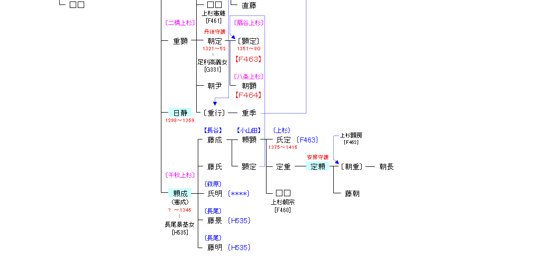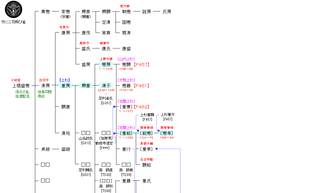 | F455:藤原盛実 | 藤原高藤 ― 藤原定方 ― 藤原説孝 ― 藤原盛実 ― 上椙盛憲 | F456:上椙盛憲 |