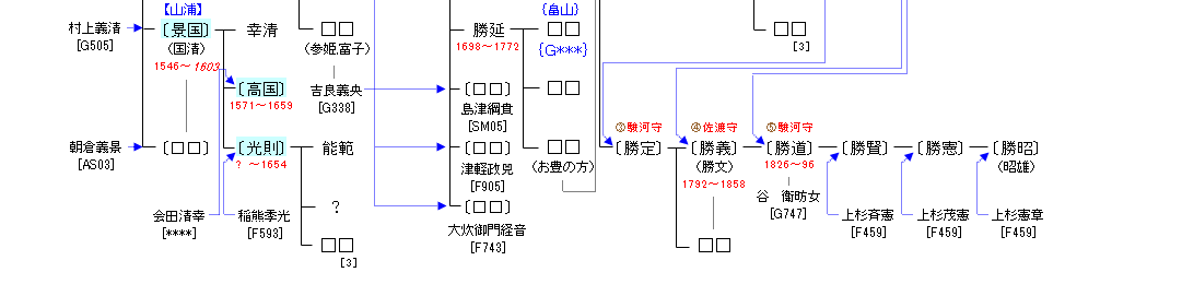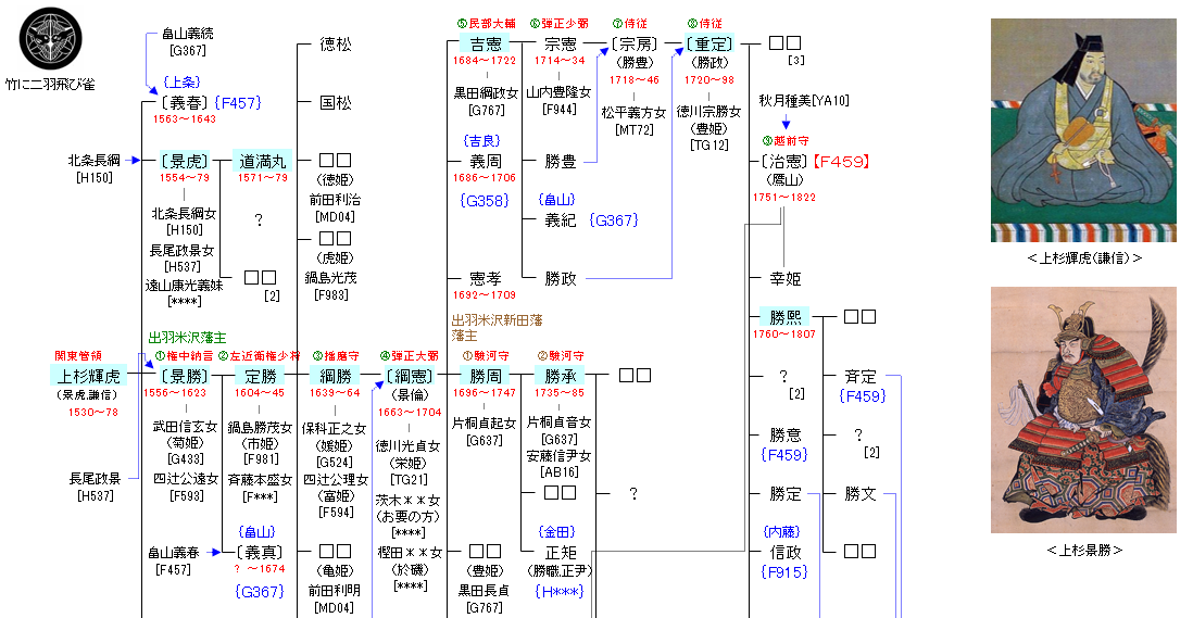 | F457:上杉憲顕 | 藤原高藤 ― 藤原定方 ― 藤原説孝 ― 藤原盛実 ― 上椙盛憲 ― 上杉憲顕 ― 上杉輝虎 | F458:上杉輝虎 |