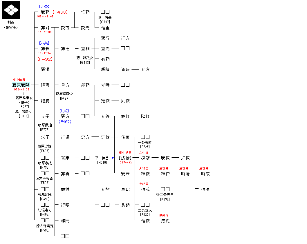 | F467:坊城為房 | 藤原高藤 ― 甘露寺為輔 ― 藤原宣孝 ― 坊城為房 ― 藤原顕隆 | F487:藤原顕隆 |