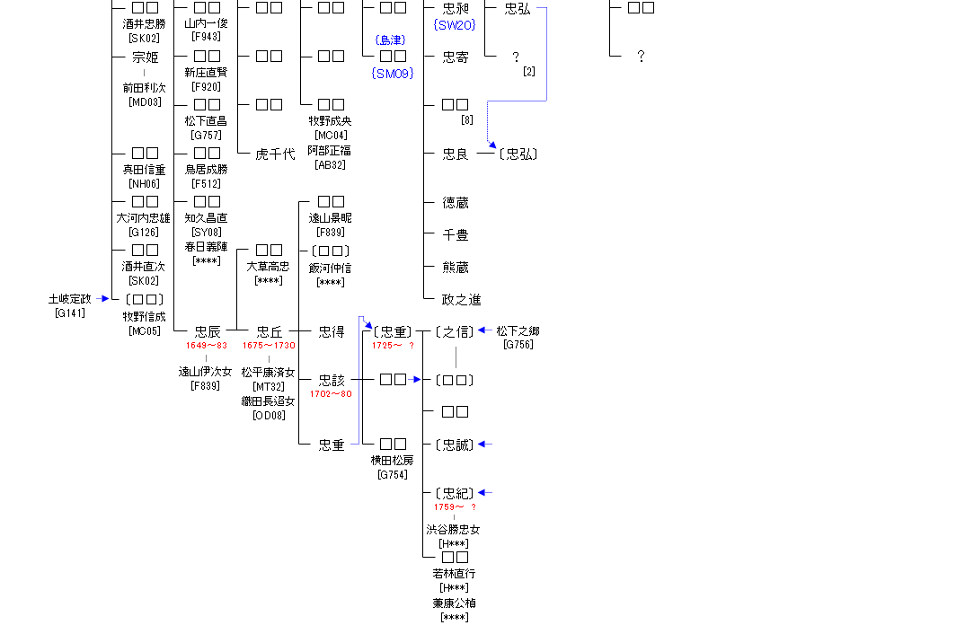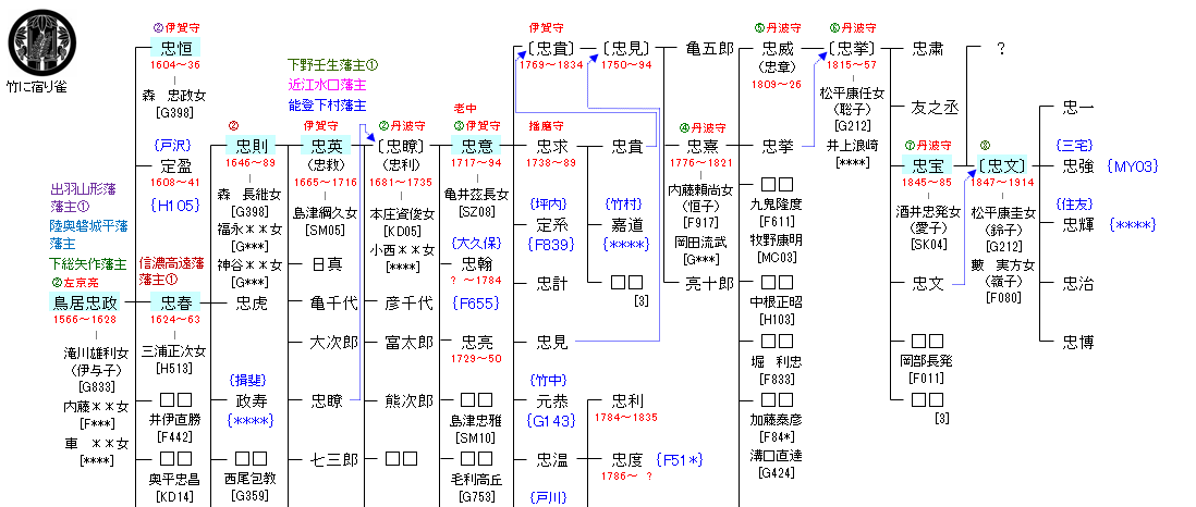 | F512:鳥居忠吉 | 藤原房前 ― 藤原冬嗣 ― 藤原良房 ― 藤原忠平 ― 藤原師尹 ― 鳥居行範 ― 鳥居忠吉 ― 鳥居忠政 | F513:鳥居忠政 |
