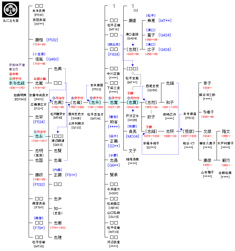 | F532:本多康将 | 藤原房前 ― 藤原冬嗣 ― 藤原師輔 ― 藤原兼通 ― 本多助秀 ― 本多正忠 ― 本多康将 ― 本多忠統 | F533:本多忠統 | ● |