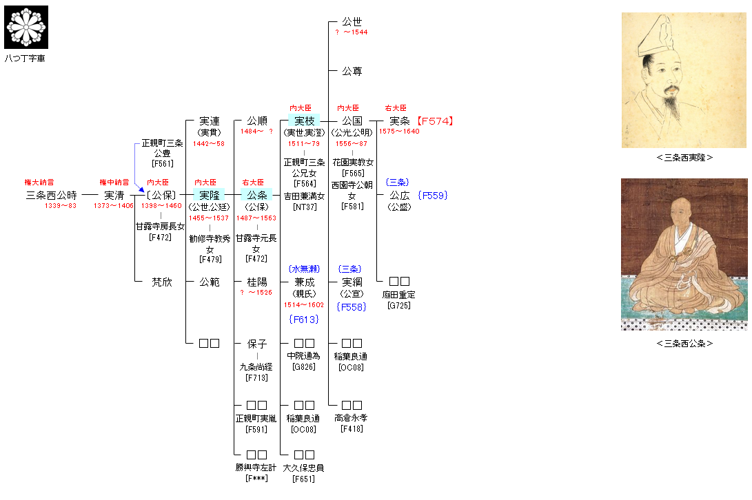 | F561:正親町三条公氏 | 藤原公季 ― 藤原公実 ― 三条公教 ― 正親町三条公氏 ― 三条西公時 | F573:三条西公時 |