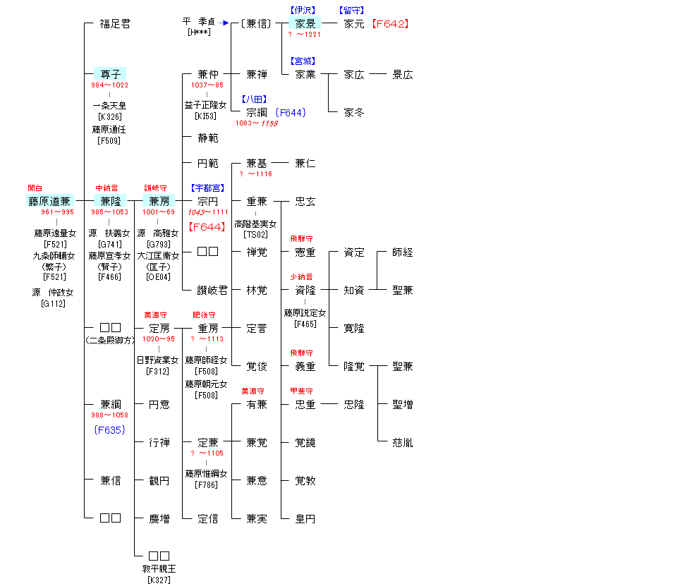 | F521:藤原師輔 | 藤原房前 ― 藤原冬嗣 ― 藤原良房 ― 藤原忠平 ― 藤原師輔 ― 藤原道兼 | F641:藤原道兼 |