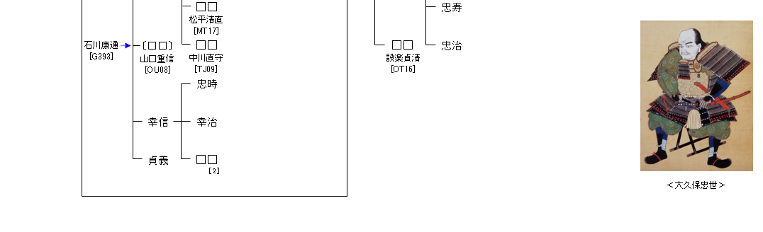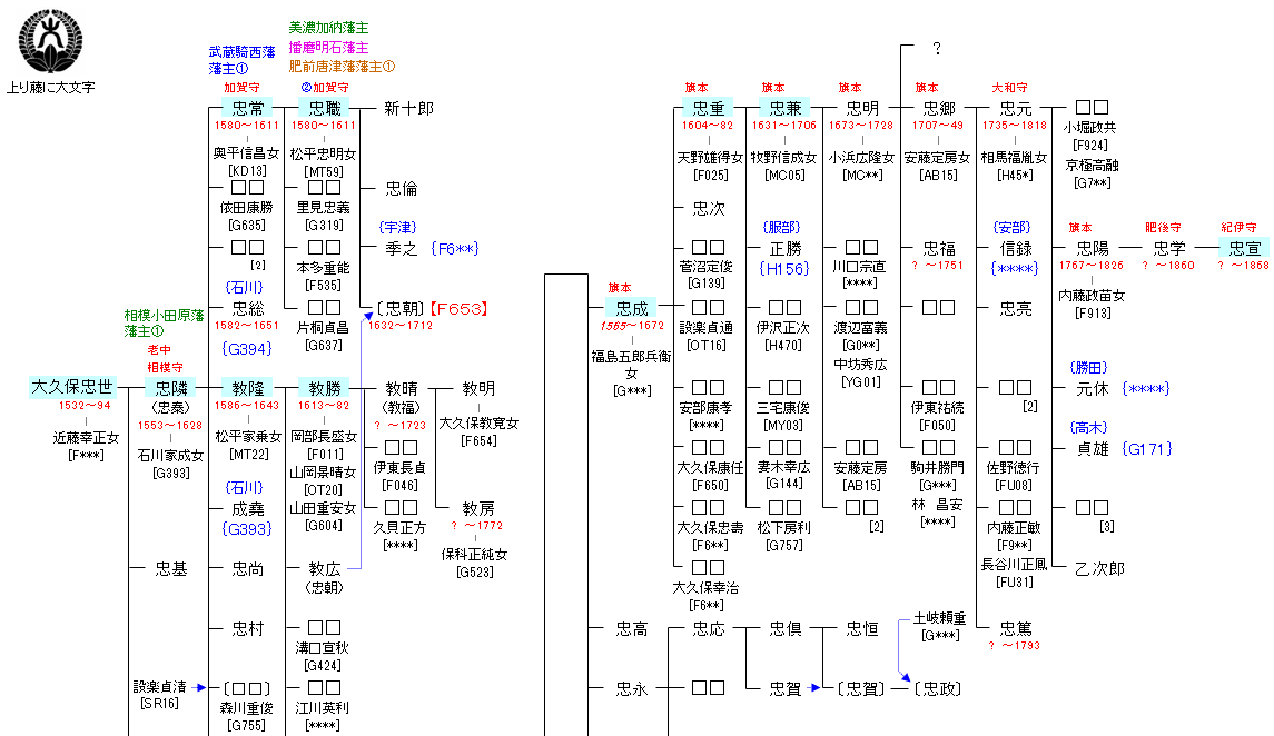 | F651:大久保忠員 | 藤原道兼 ― 宇都宮宗円 ― 宇都宮泰綱 ― 武茂泰宗 ― 宇津忠茂 ― 大久保忠員 ― 大久保忠世 | F652:大久保忠世 |