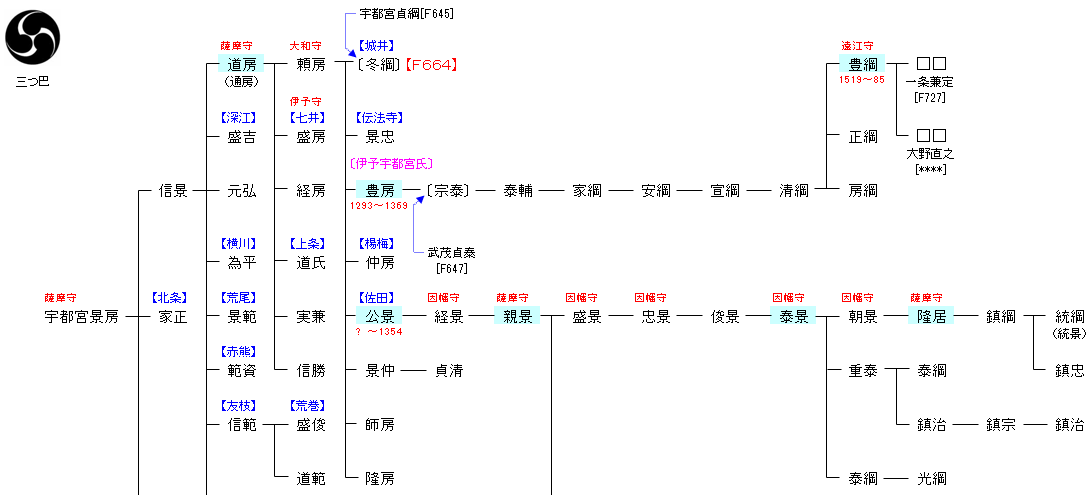 | F662:宇都宮信房 | 藤原師輔 ― 藤原道兼 ― 宇都宮宗円 ― 宇都宮信房 ― 宇都宮景房 | F663:宇都宮景房 |