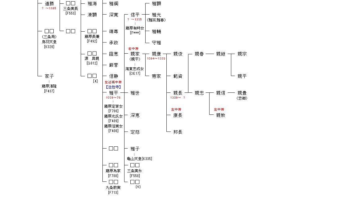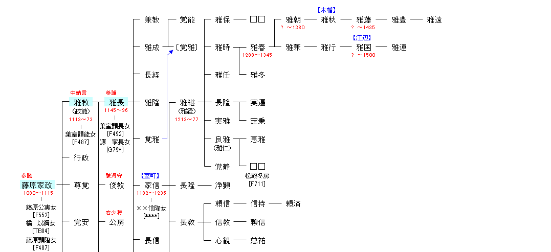 | F701:藤原道長 | 藤原房前 ― 藤原冬嗣 ― 藤原良房 ― 藤原忠平 ― 藤原師輔 ― 藤原道長 ― 藤原家政 | F732:藤原家政 | ● |