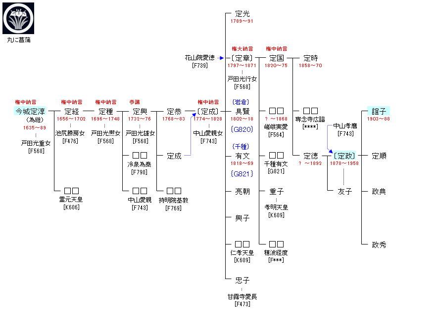 | F789:冷泉為相 | 藤原道長 ― 藤原長家 ― 二条俊忠 ― 藤原俊成 ― 藤原定家 ― 冷泉為相 ― 今城定淳 | F744:今城定淳 | ● |