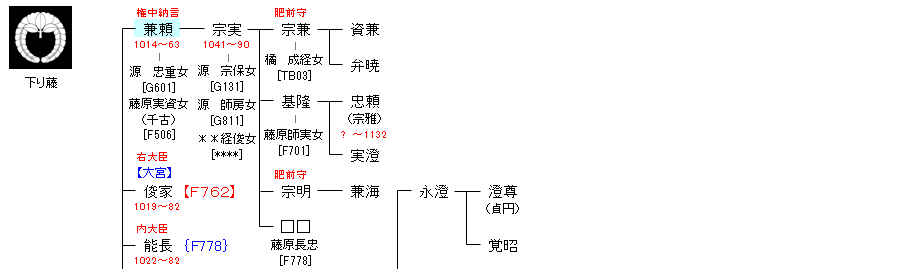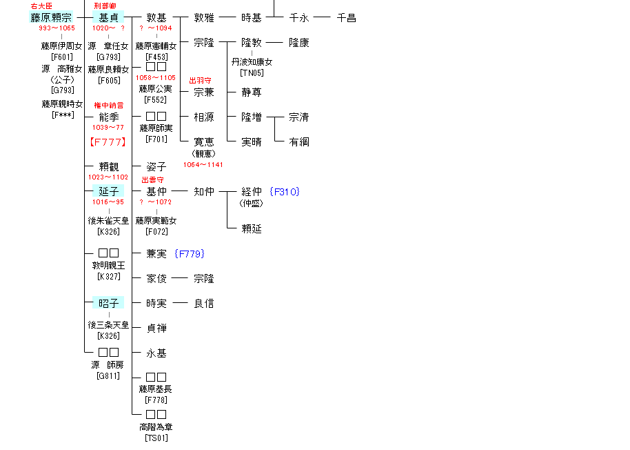 | F701:藤原道長 | 藤原房前 ― 藤原冬嗣 ― 藤原良房 ― 藤原忠平 ― 藤原師輔 ― 藤原道長 ― 藤原頼宗 | F761:藤原頼宗 |