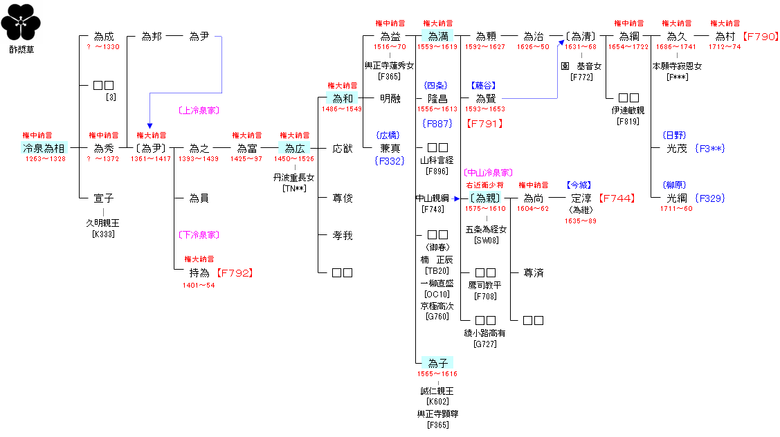 | F788:藤原定家 | 藤原道長 ― 藤原長家 ― 二条俊忠 ― 藤原俊成 ― 藤原定家 ― 冷泉為相 | F789:冷泉為相 |
