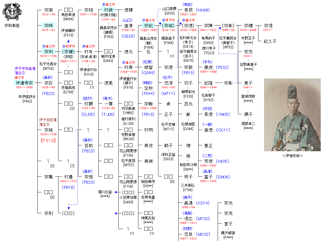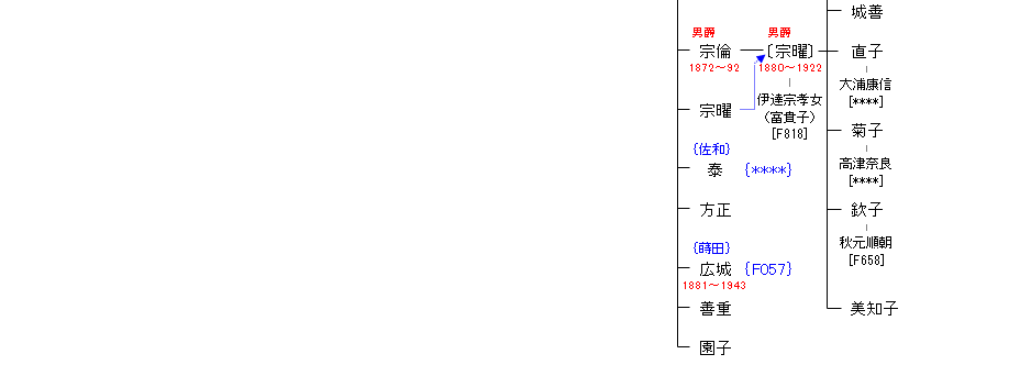 | F815:伊達政宗 | 藤原魚名 ― 藤原鷲取 ― 藤原為盛 ― 伊達朝宗 ― 伊達行宗 ― 伊達政宗 ― 伊達秀宗 | F817:伊達秀宗 |
