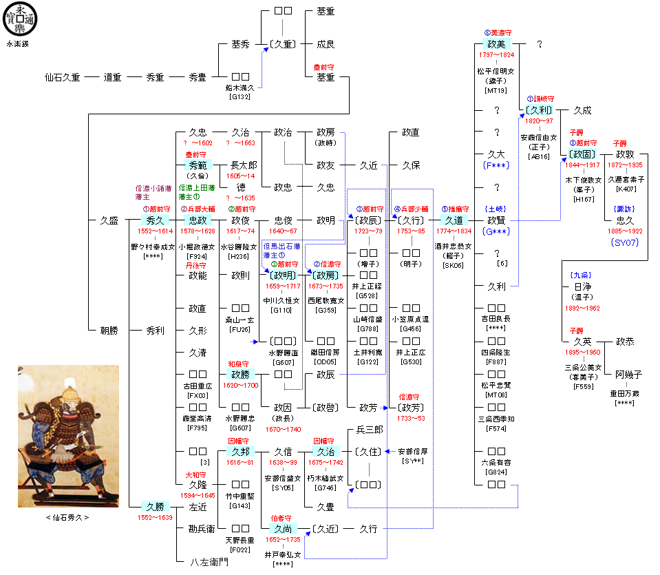 | F865:後藤則明 | 藤原魚名 ― 藤原利仁 ― 斎藤伊傳 ― 後藤則明 ― 仙石久重 | F872:仙石久重 | ● |