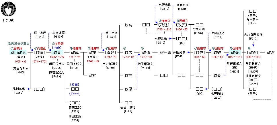 | F911:内藤忠興 | 藤原魚名 ― 藤原秀郷 ― 内藤行俊 ― 内藤重清 ― 内藤忠興 ― 遠山政亮 | F912:遠山政亮 | ● |