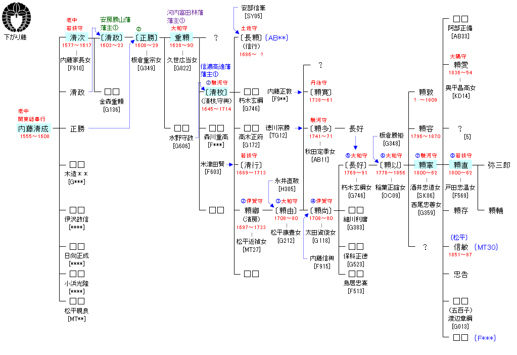 | F916:内藤忠郷 | 藤原魚名 ― 藤原秀郷 ― 内藤行俊 ― 内藤重清 ― 内藤忠郷 ― 内藤清成 | F917:内藤清成 | ● |