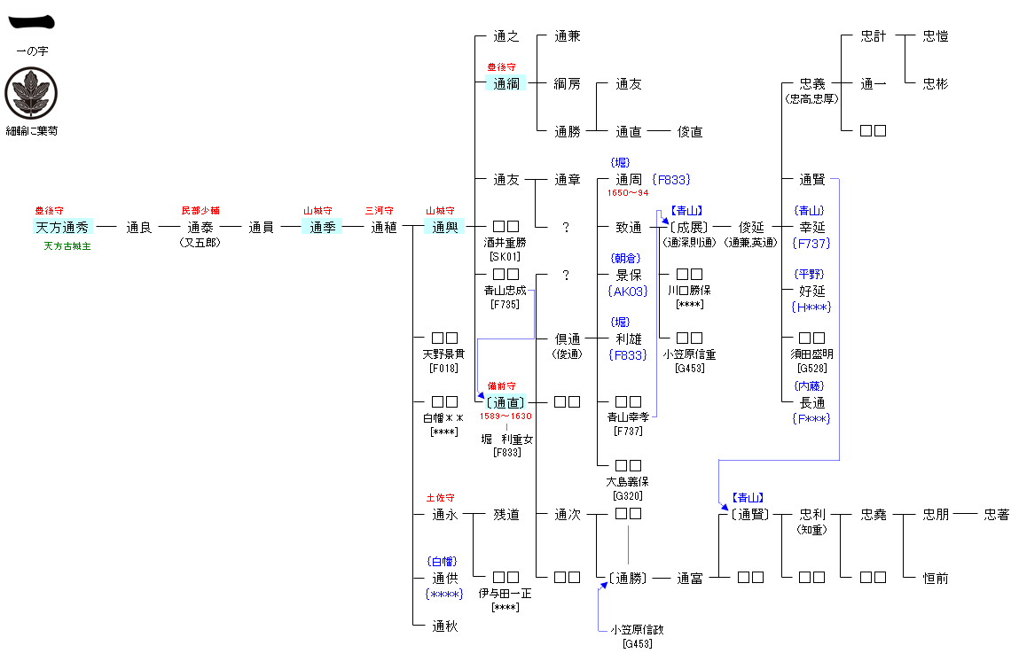 | F940:山内首藤俊通 | 藤原秀郷 ― 藤原千常 ― 佐藤公清 ― 首藤助清 ― 山内首藤俊通 ― 天方通秀 | F948:天方通秀 | ● |