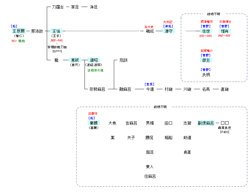 出自について『船氏王後墓誌』では、王智仁(王辰爾)の孫で、那沛故の子とする。船氏は河内国丹比郡野中郷(大阪府藤井寺市,羽曳野市)を本拠地としたとされる渡来系氏族で、欽明天皇14年(553年?)に王辰爾が船の税を数え記録したことで氏名を賜ったという。 |