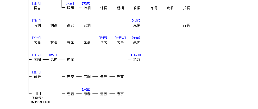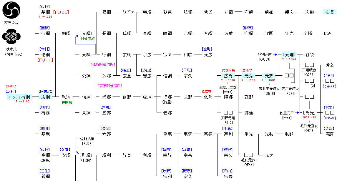 | FU02:足利成行 | 藤原秀郷 ― 藤原千常 ― 藤原兼光 ― 足利成行 ― 戸矢子有綱 | FU05:戸矢子有綱 |