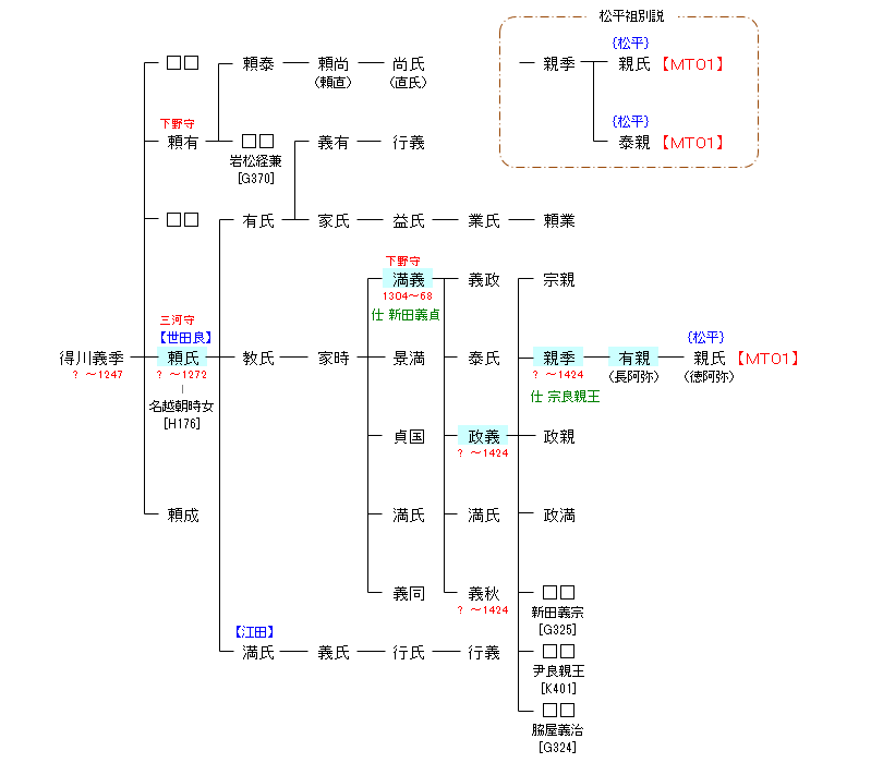| G312:新田義重 | 源 経基 ― 源 頼信 ― 源 義国 ― 新田義重 ― 得川義季 | G330:得川義季 |