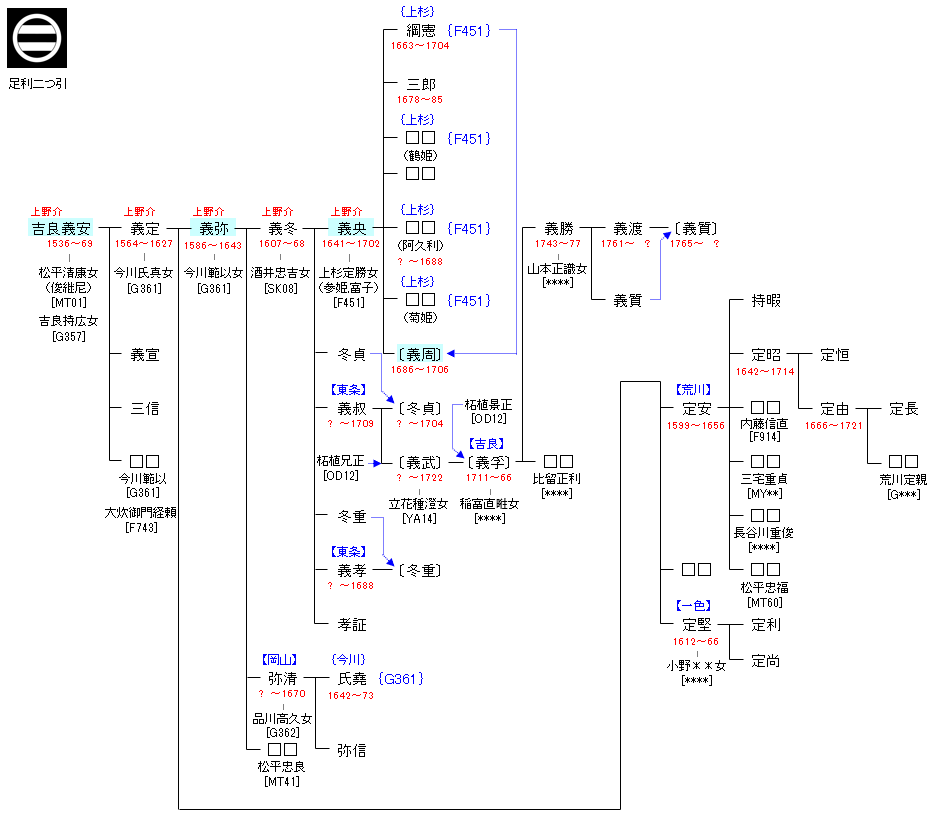 | G357:吉良長氏 | 源 経基 ― 源 頼信 ― 源 義国 ― 足利義氏 ― 吉良長氏 ― 吉良義安 | G358:吉良義安 | ● |