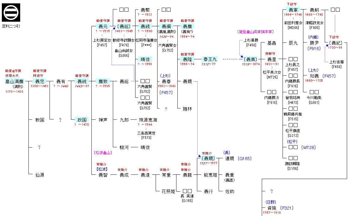 | G366:畠山義純 | 源 経基 ― 源 頼信 ― 源 義国 ― 畠山義純 ― 畠山満慶 | G367:畠山満慶 | ● |