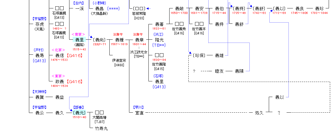 | G413:佐竹貞義 | 源 経基 ― 源 頼信 ― 源 義光 ― 佐竹義業 ― 佐竹貞義 ― 佐竹義俊 | G414:佐竹義俊 |