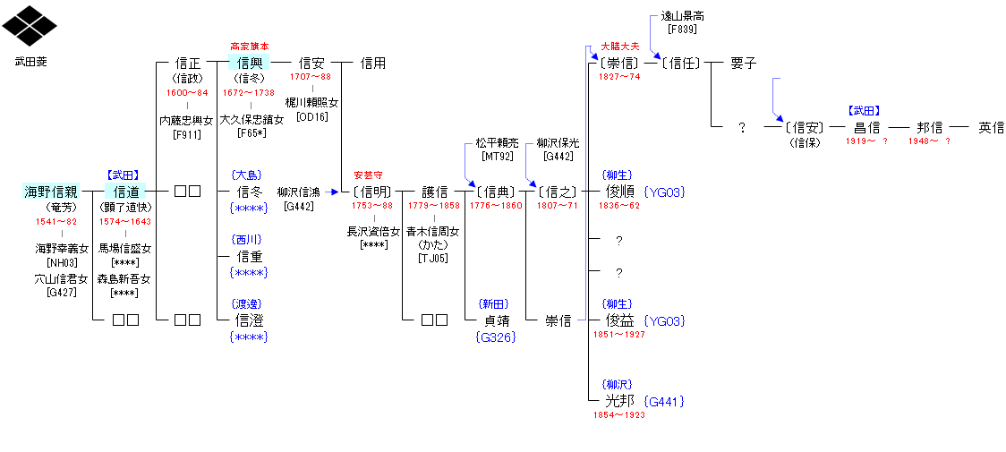 | G433:武田晴信 | 源 義光 ― 源 義清 ― 武田信義 ― 武田信光 ― 武田信成 ― 武田信虎 ― 武田晴信 ― 海野信親 | G434:海野信親 | ● |