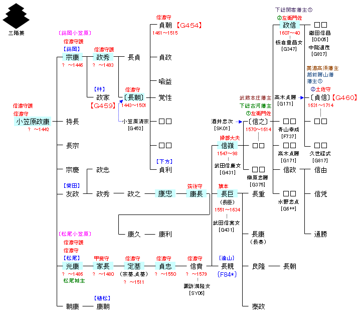 | G452:小笠原長忠 | 源 経基 ― 源 頼信 ― 源 義光 ― 源 義清 ― 小笠原長清 ― 小笠原長忠 ― 小笠原政康 | G453:小笠原政康 |
