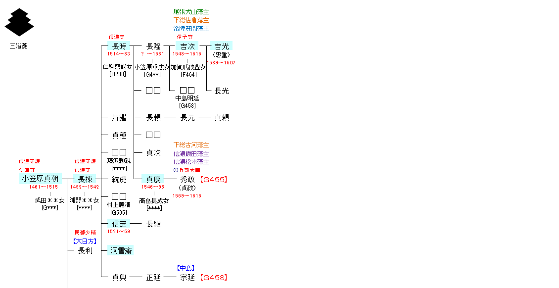 | G453:小笠原政康 | 源 義清 ― 小笠原長清 ― 小笠原長忠 ― 小笠原政康 ― 小笠原貞朝 | G454:小笠原貞朝 |