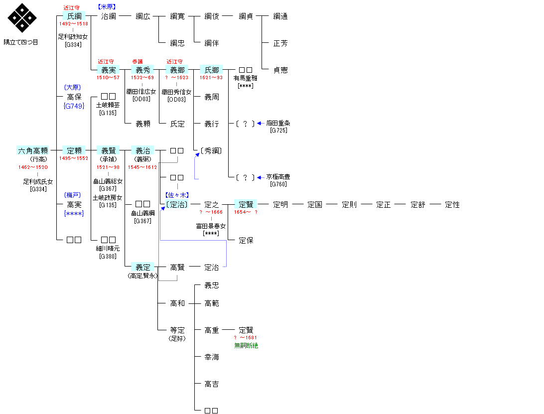 | G751:六角泰綱 | 源 雅信 ― 源 扶義 ― 佐々木定綱 ― 佐々木信綱 ― 六角泰綱 ― 六角高頼 | G752:六角高頼 | ● |