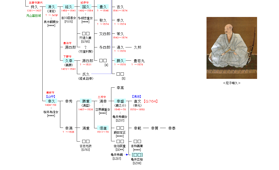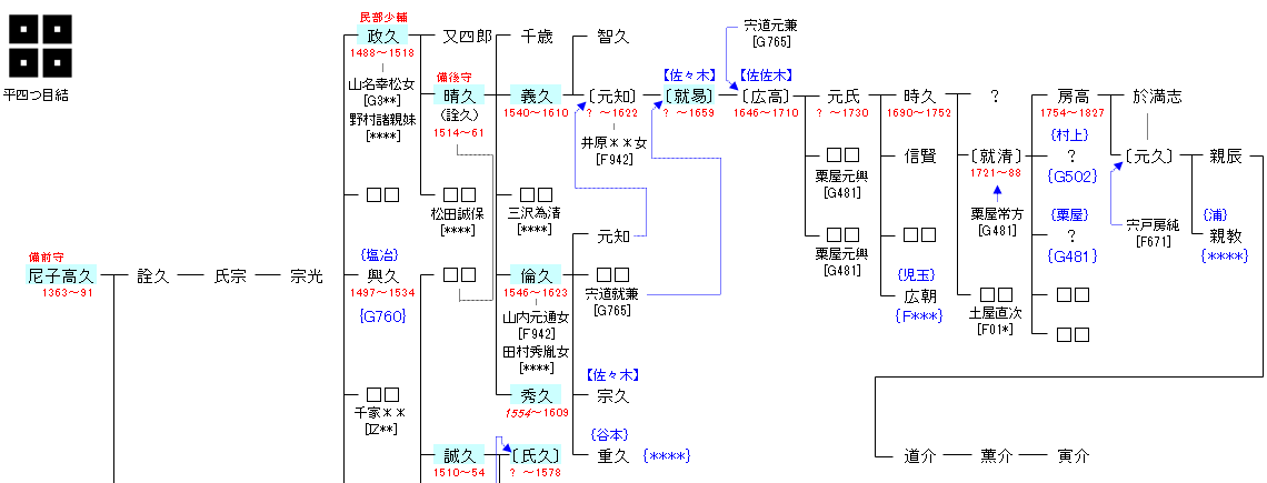| G758:京極氏信 | 源 雅信 ― 源 扶義 ― 佐々木定綱 ― 佐々木信綱 ― 京極氏信 ― 尼子高久 | G763:尼子高久 |