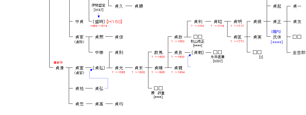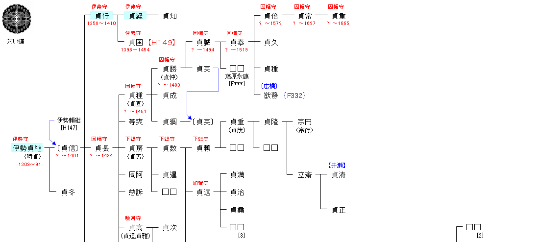 | H147:伊勢俊継 | 平 高望 ― 平 良望 ― 平 維衡 ― 平 季衡 ― 伊勢俊継 ― 伊勢貞継 | H148:伊勢貞継 |