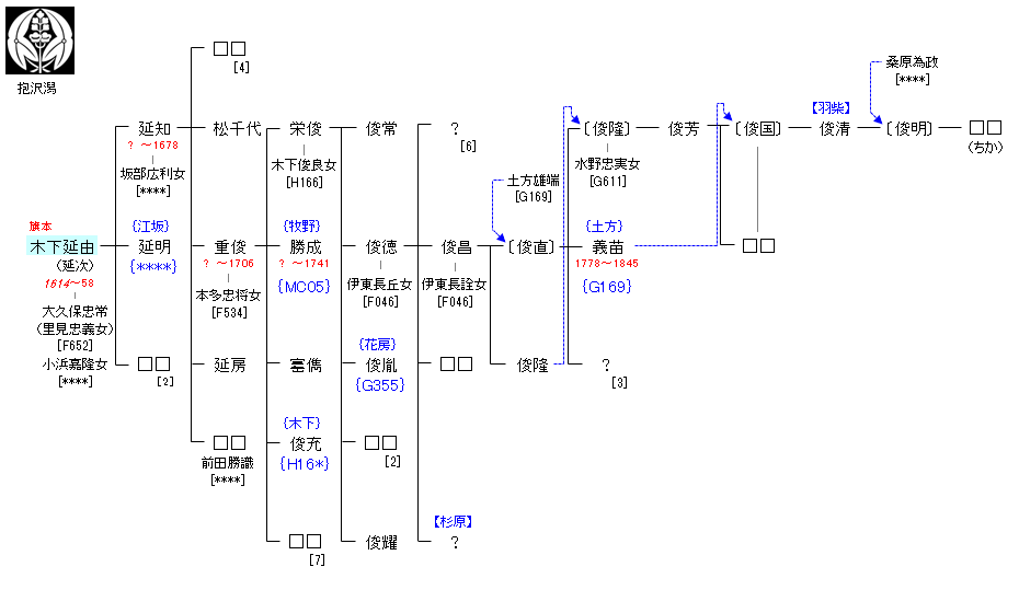 | H166:木下延俊 | 平 維衡 ― 安濃津貞衡 ― 杉原光平 ― 杉原家利 ― 木下家定 ― 木下延俊 ― 木下延由 | H167:木下延由 | ● |