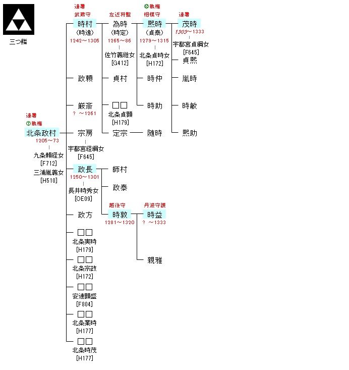 | H171:北条時方 | 平 高望 ― 平 良望 ― 北条時方 ― 北条政村 | H178:北条政村 | ● |
