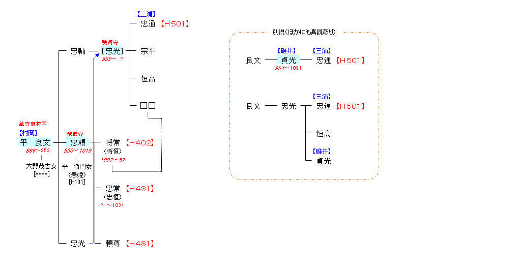 妻は平将門の娘・春姫。平将門とは従兄弟にあたる。父と同じく村岡を号とし村岡次郎と称した。名は経明,恒明とも。 忠頼は、平繁盛が延暦寺に金泥大般若経600巻を書写して奉納しようとした際に、かの仇敵を駆逐するためという理由から忠光とともにこれを妨害した。平将門の乱を鎮圧した平繁盛を仇敵と呼んでいたことから、忠頼の父である良文は平将門と親しかったものと思われる。寛仁2年12月17日に90歳で死去したとされるが、伝説と思われる。